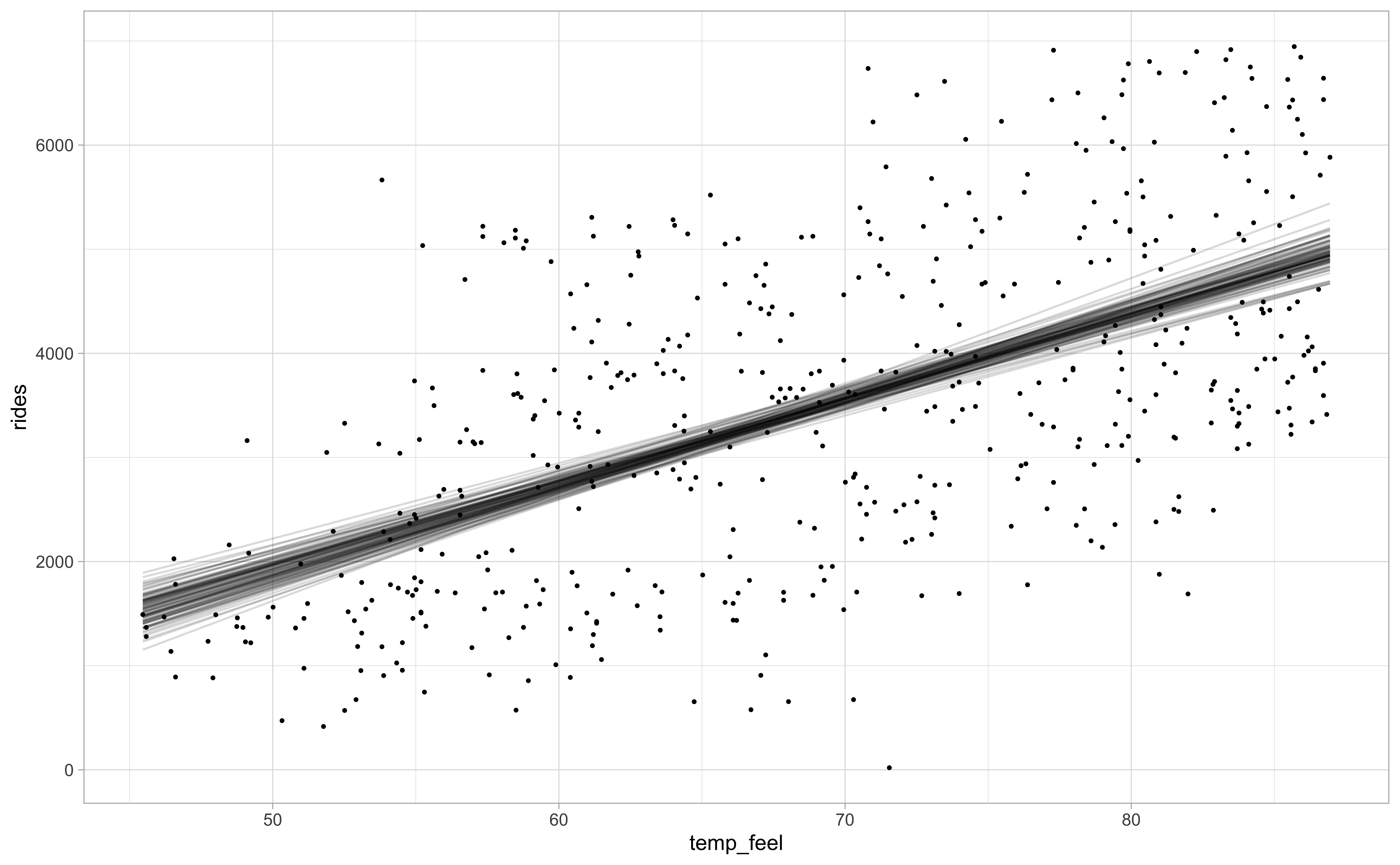 rstanarm::stan_glm()rstanarm uses RStan syntax1 to do Bayesian inference for applied regression models (arm).bike_model <- rstanarm::stan_glm(rides ~ temp_feel, data = bikes,