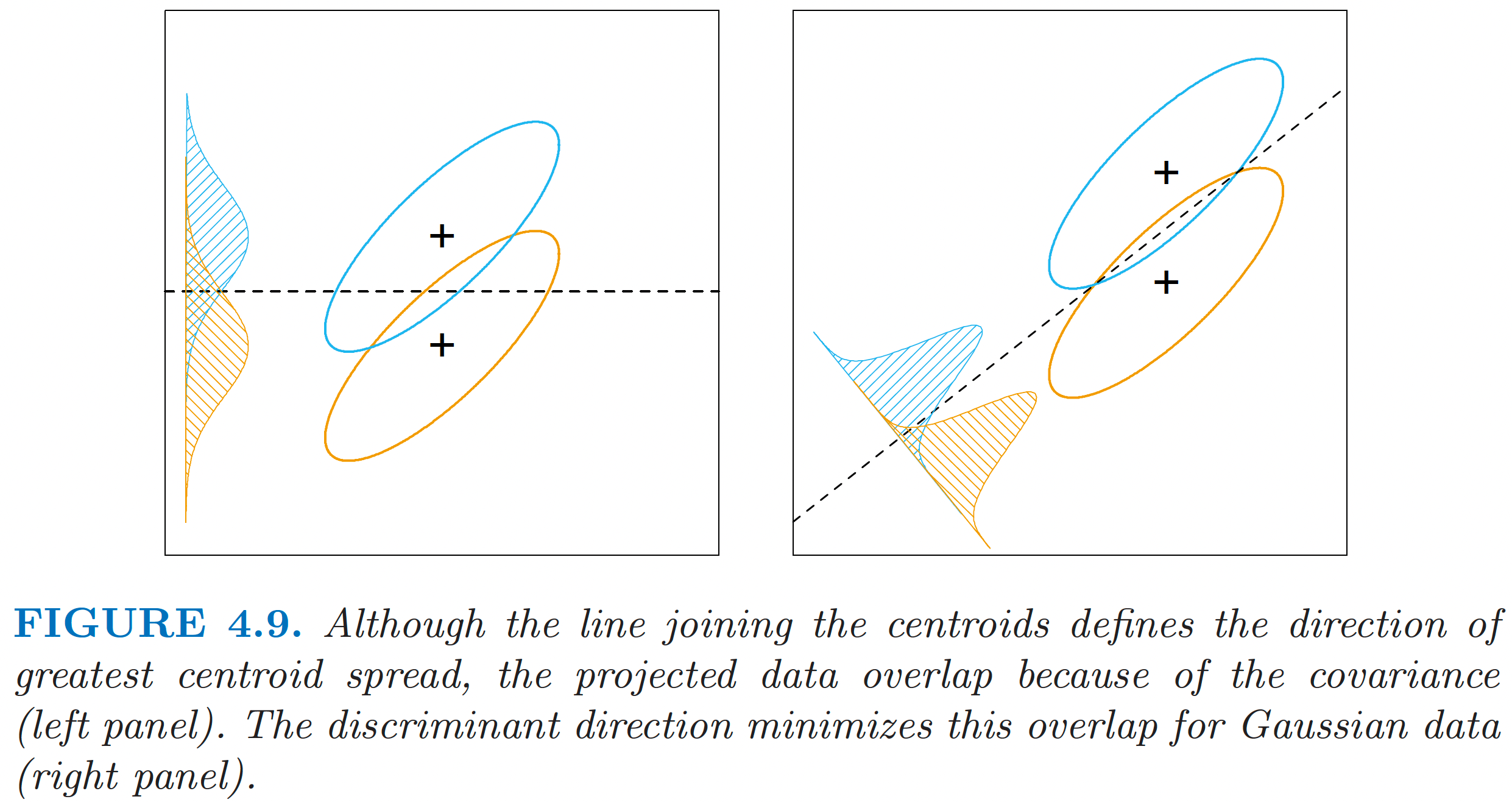 The decision boundary of LDA is a linear function of \(\mathbf{x}\).
