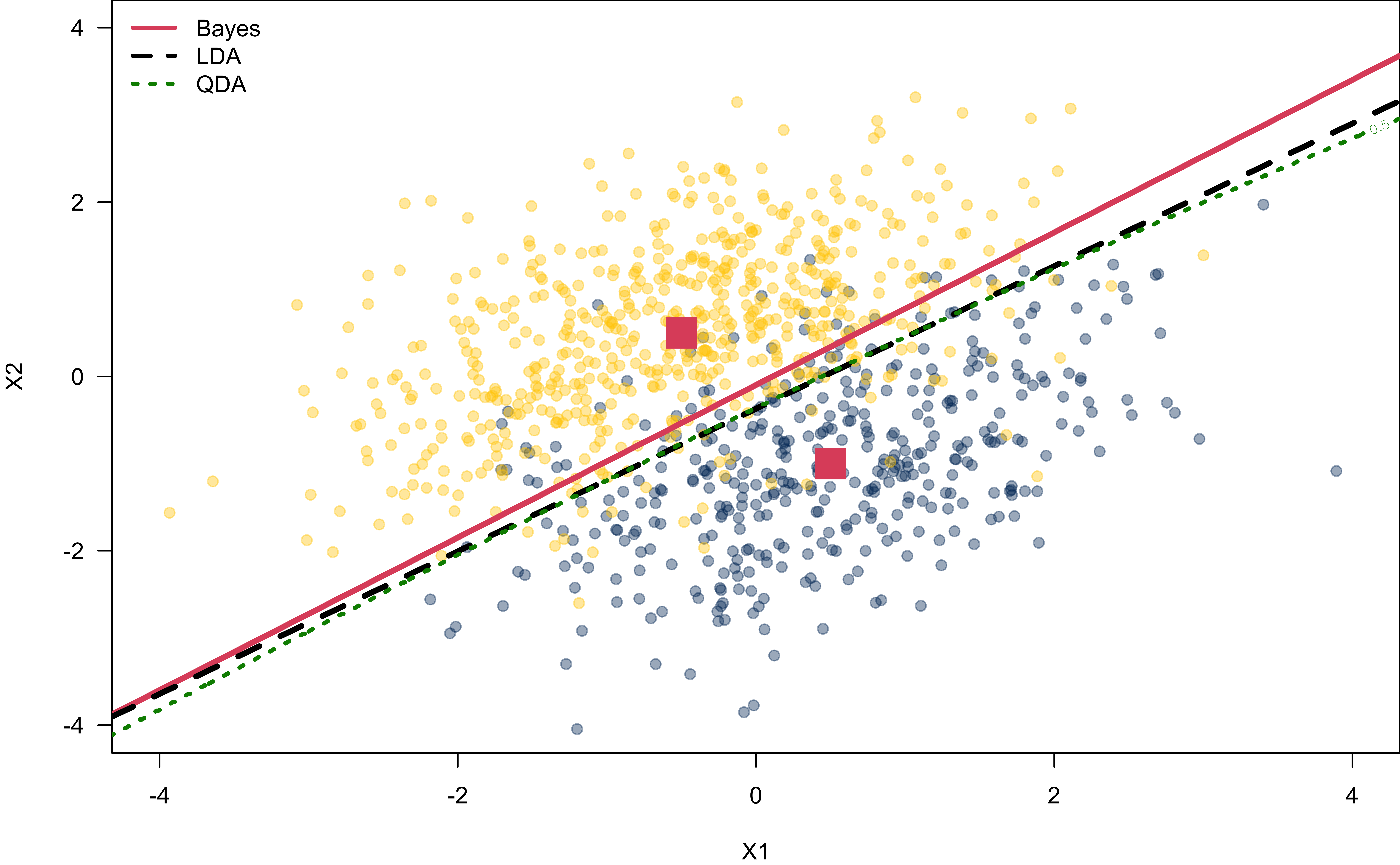 QDA is recommended if \(n\) is relatively large so that the variance of the classifier is not a major concern.