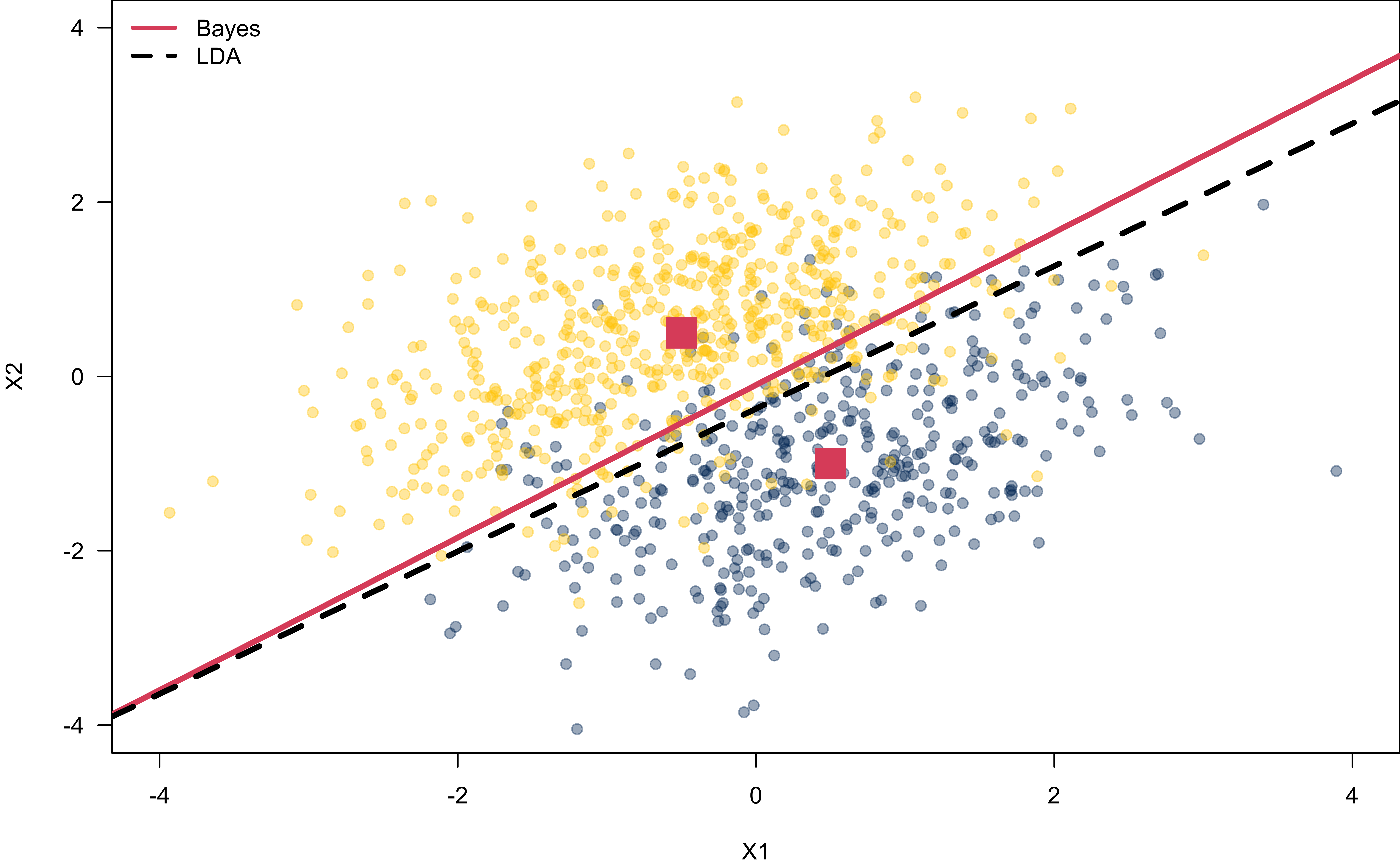 LDA is a special case of QDA with \(d_{kjl} = 0\) for all \(k, j\) and \(l\). \((\Sigma_1 = \cdots = \Sigma_k = \Sigma)\)