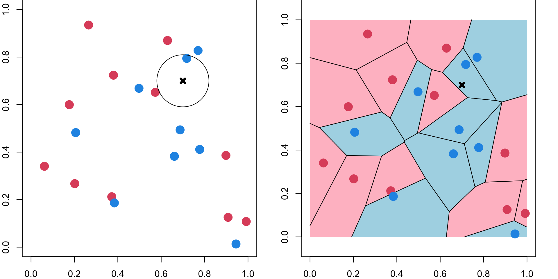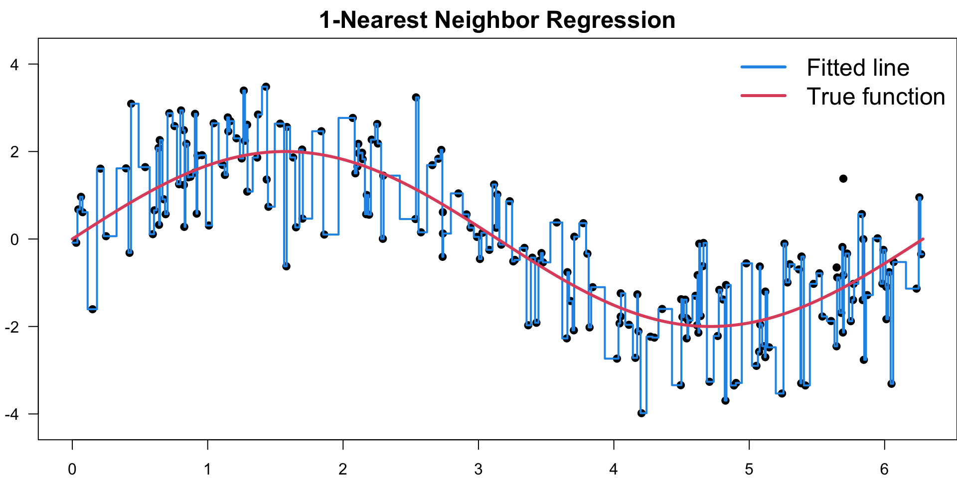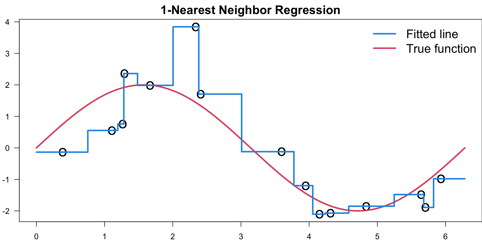 \[ \widehat{y}_0 = \frac{1}{k} \sum_{x_i \in N_k(x_0)} y_i,\] where the neighborhood of \(x_0\), \(N_k(x_0)\), defines the \(k\) training data points that are closest to \(x_0\).