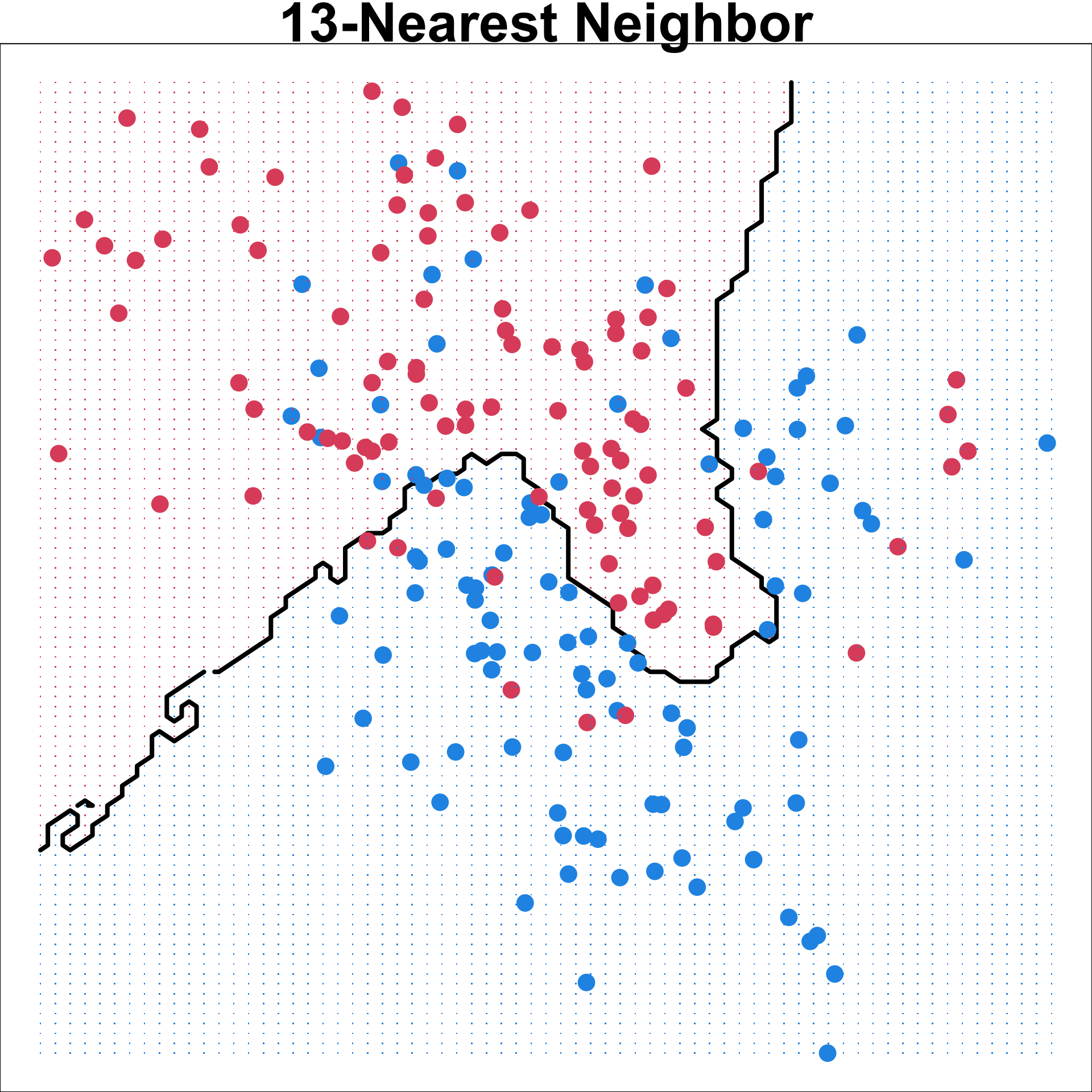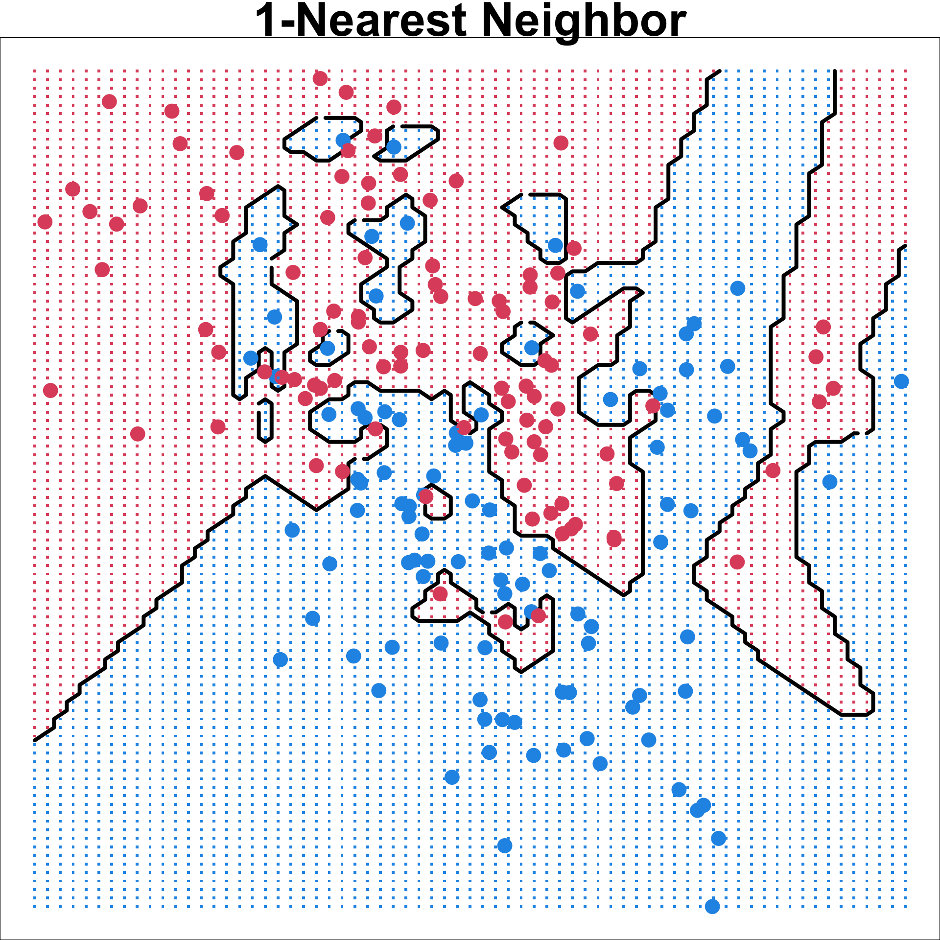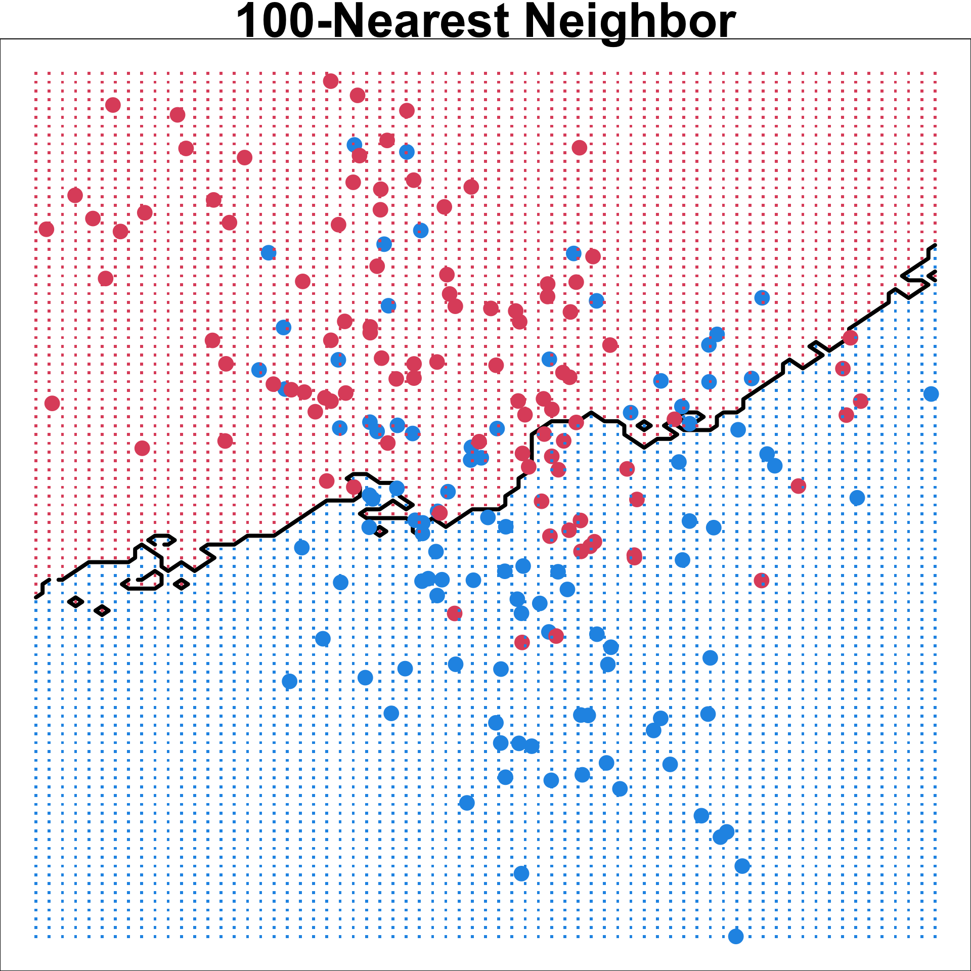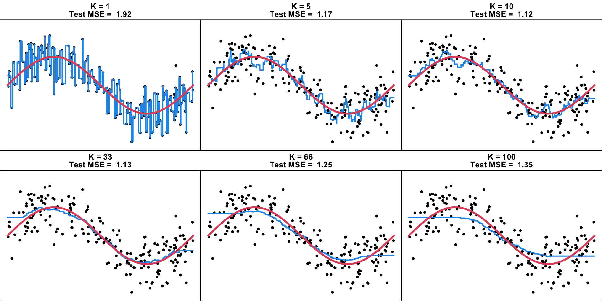 \[ \widehat{y}_0 = \frac{1}{k} \sum_{x_i \in N_k(x_0)} y_i,\] where the neighborhood of \(x_0\), \(N_k(x_0)\), defines the \(k\) training data points that are closest to \(x_0\).