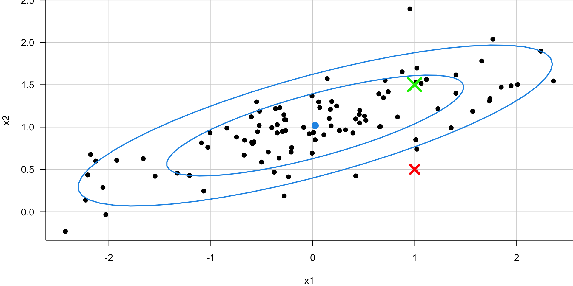The red point is farther away from the center in terms of Mahalanobis distance.
