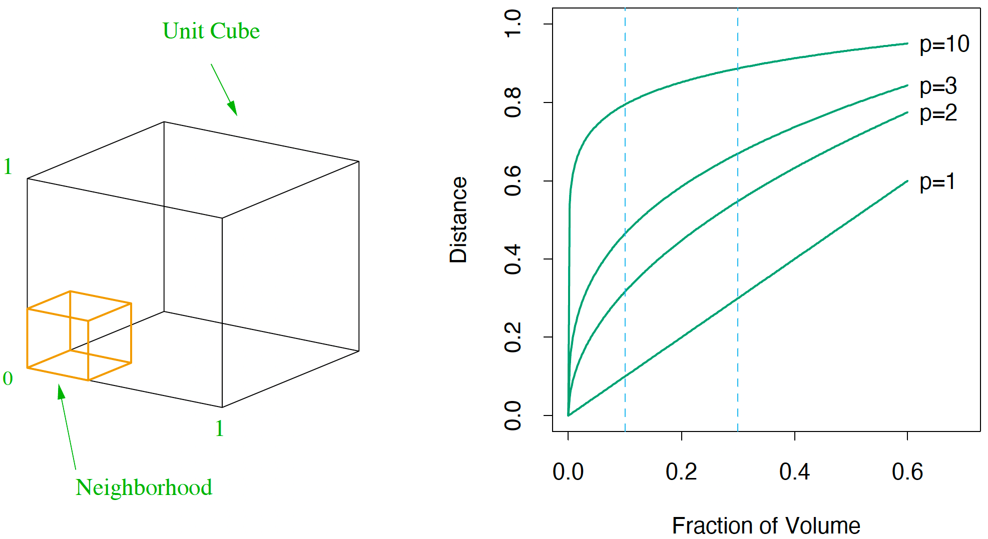 In 10 dimensions we need to cover 80% of the range of each coordinate to capture 10% of the data.