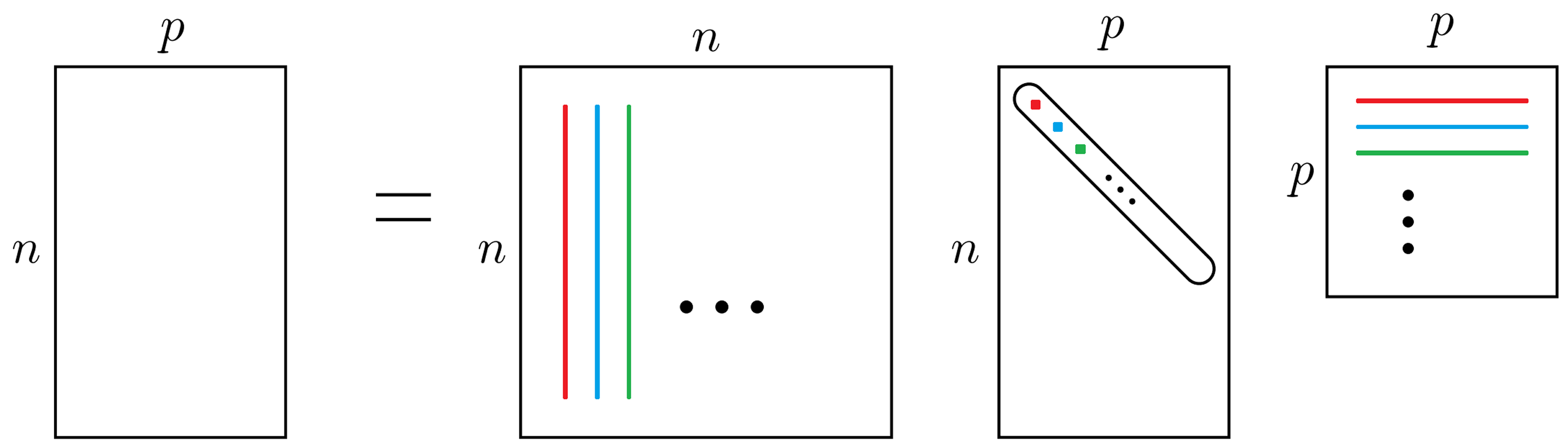 \[\mathbf{X}_{n\times p} = \mathbf{U}_{n \times n} \mathbf{D}_{n \times p} \mathbf{V}'_{p \times p}\] where \(\mathbf{U}\) and \(\mathbf{V}\) are orthogonal matrices, and \(\mathbf{D}\) is diagonal with diagonal elements singular values \(d_1 \ge d_2 \ge \cdots \ge d_p\).