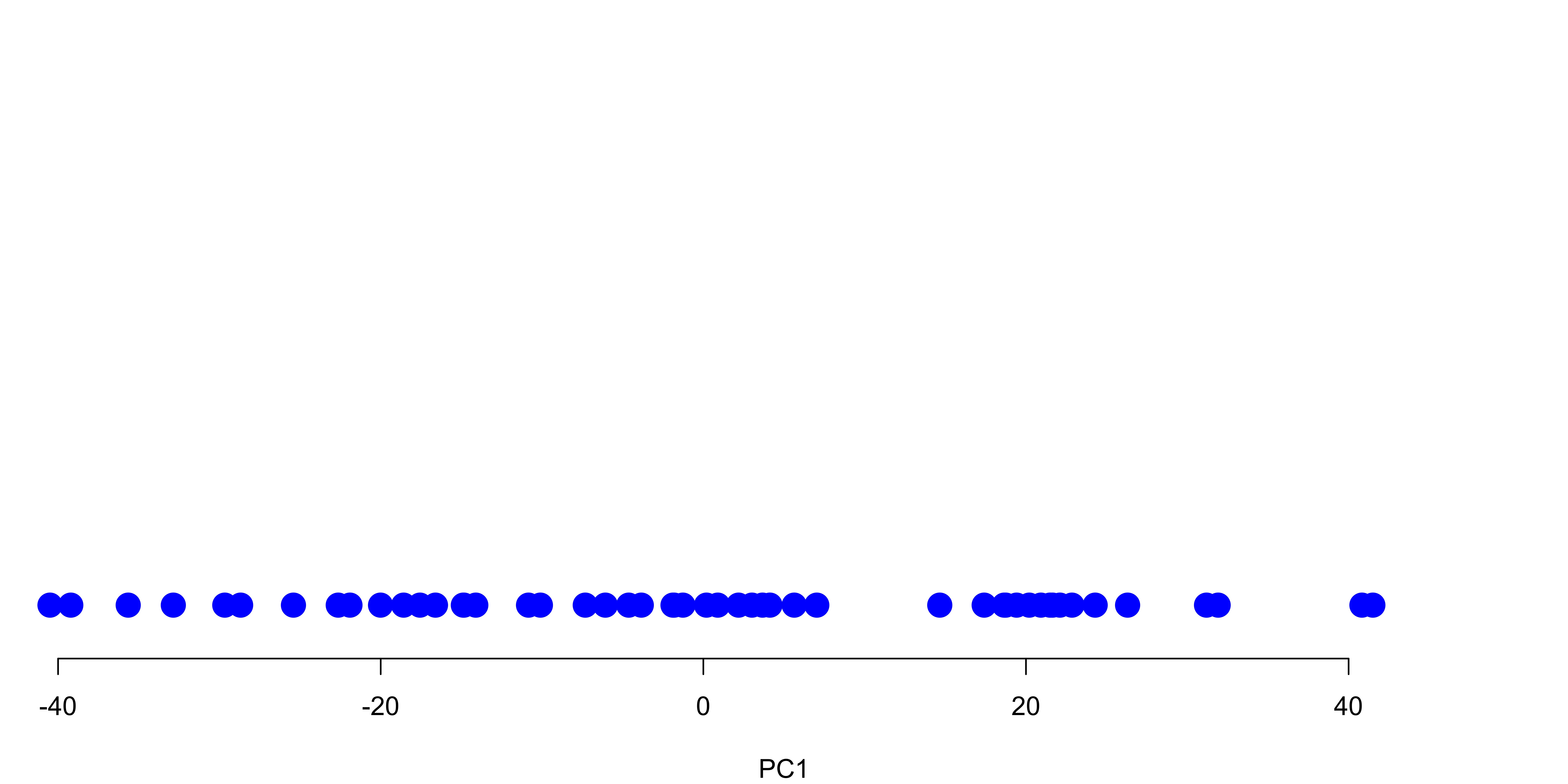 PC1 accounts for \(17/19 = 89\%\) of the total variation, and PC2 accounts for \(2/19 = 11\%\) of the total variation.