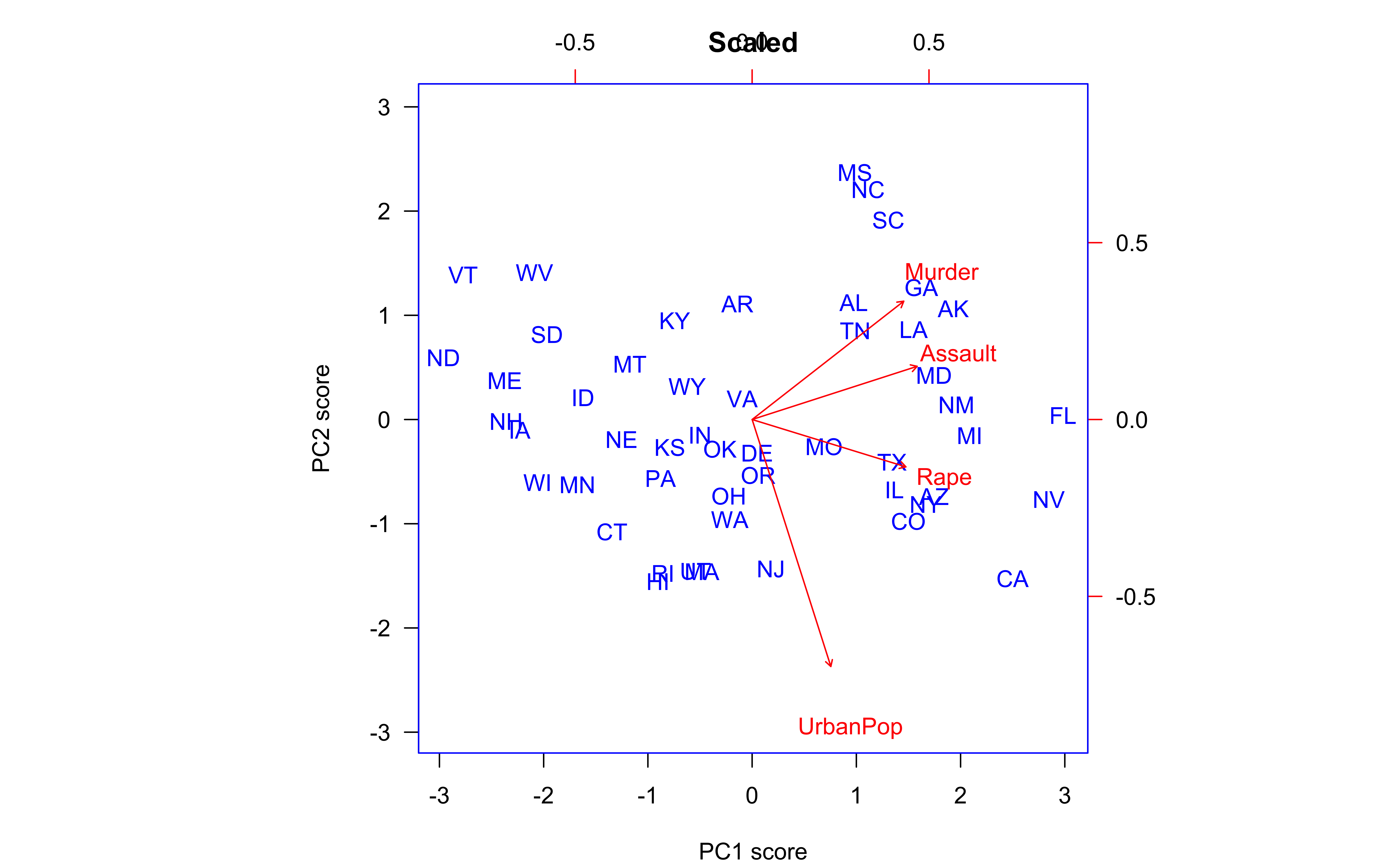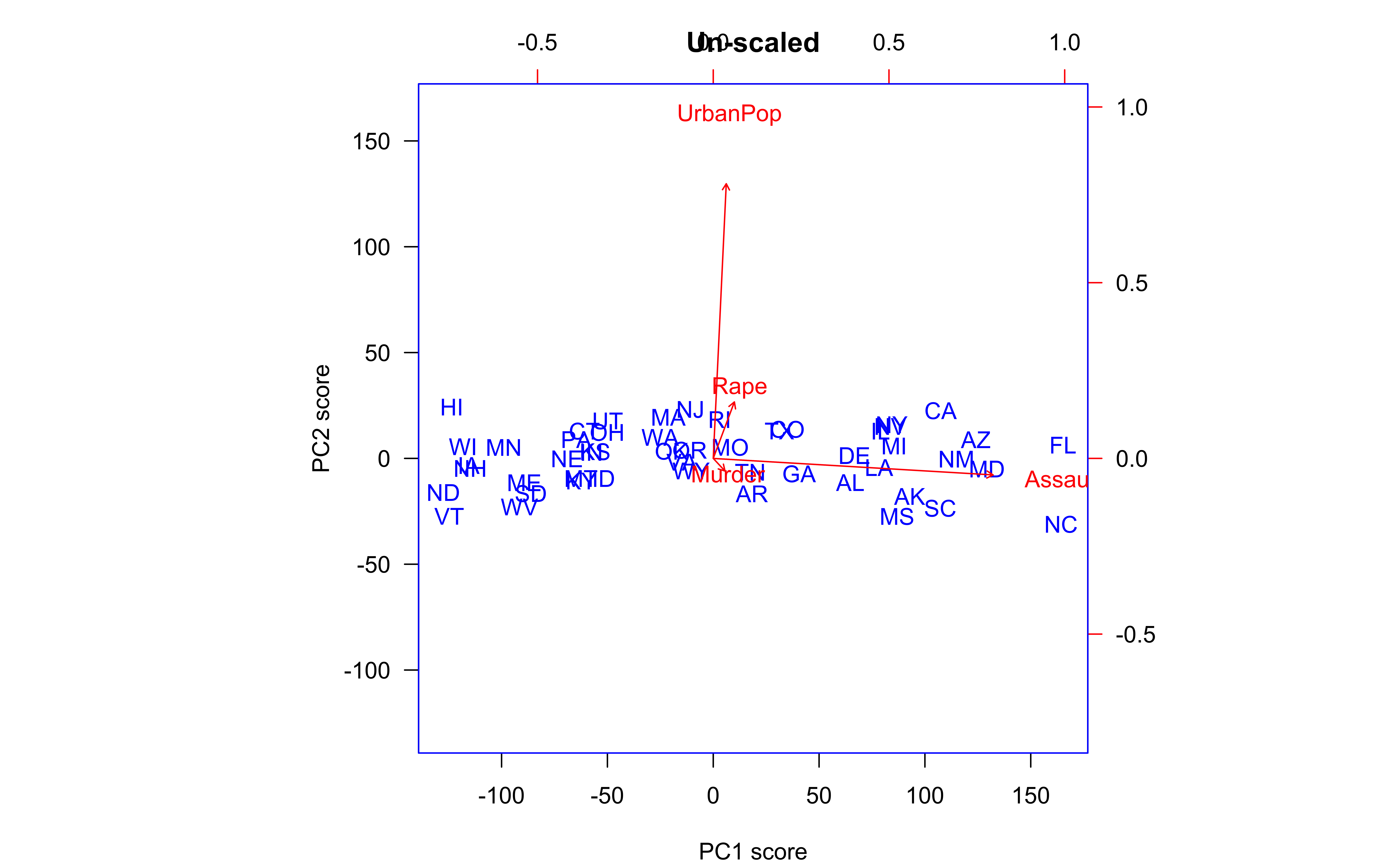 scale = 0)UrbanPop.Assualt, Murder and Rape) are located close to each other.UrbanPop is far from the other three.Assualt, Murder and Rape are more correlated, and UrbanPop is less correlated with the other three.